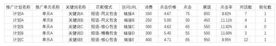 通過上圖,我們可以很清楚地看到每個關(guān)鍵詞的消費、點擊、展現(xiàn)、對話、轉(zhuǎn)化數(shù)據(jù)。這樣,就能很容易地判斷出每個關(guān)鍵詞效果的好與差,接著再用四象限分析法來分析數(shù)據(jù)就方便多了(分析創(chuàng)意數(shù)據(jù)與關(guān)鍵詞數(shù)據(jù)大同小異,四象限分析法同樣適用)。