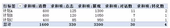 所以我們可以直接使用整理好的關(guān)鍵詞報表,將其制作成數(shù)據(jù)透視表,以方便查看各個計劃的投放效果。